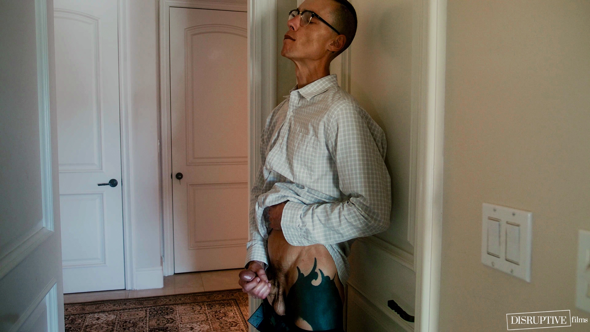 Sam drops his briefs and jerks off his very thick cock.