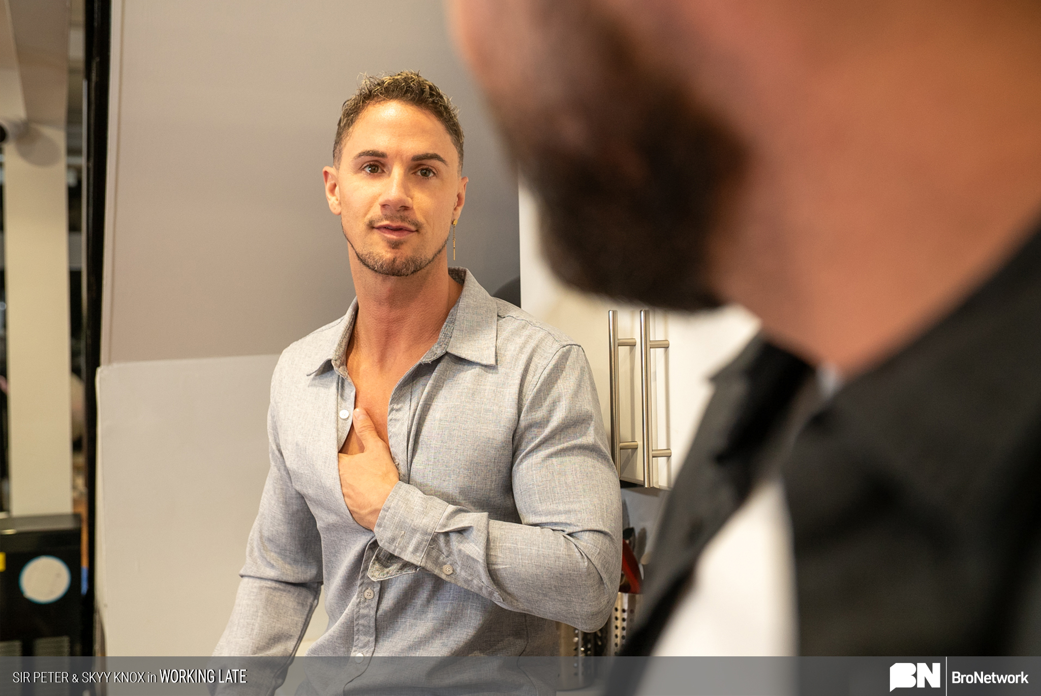 Tattooed gay mechanic Bo Sinn fucks his client Skyy Knox in the ass