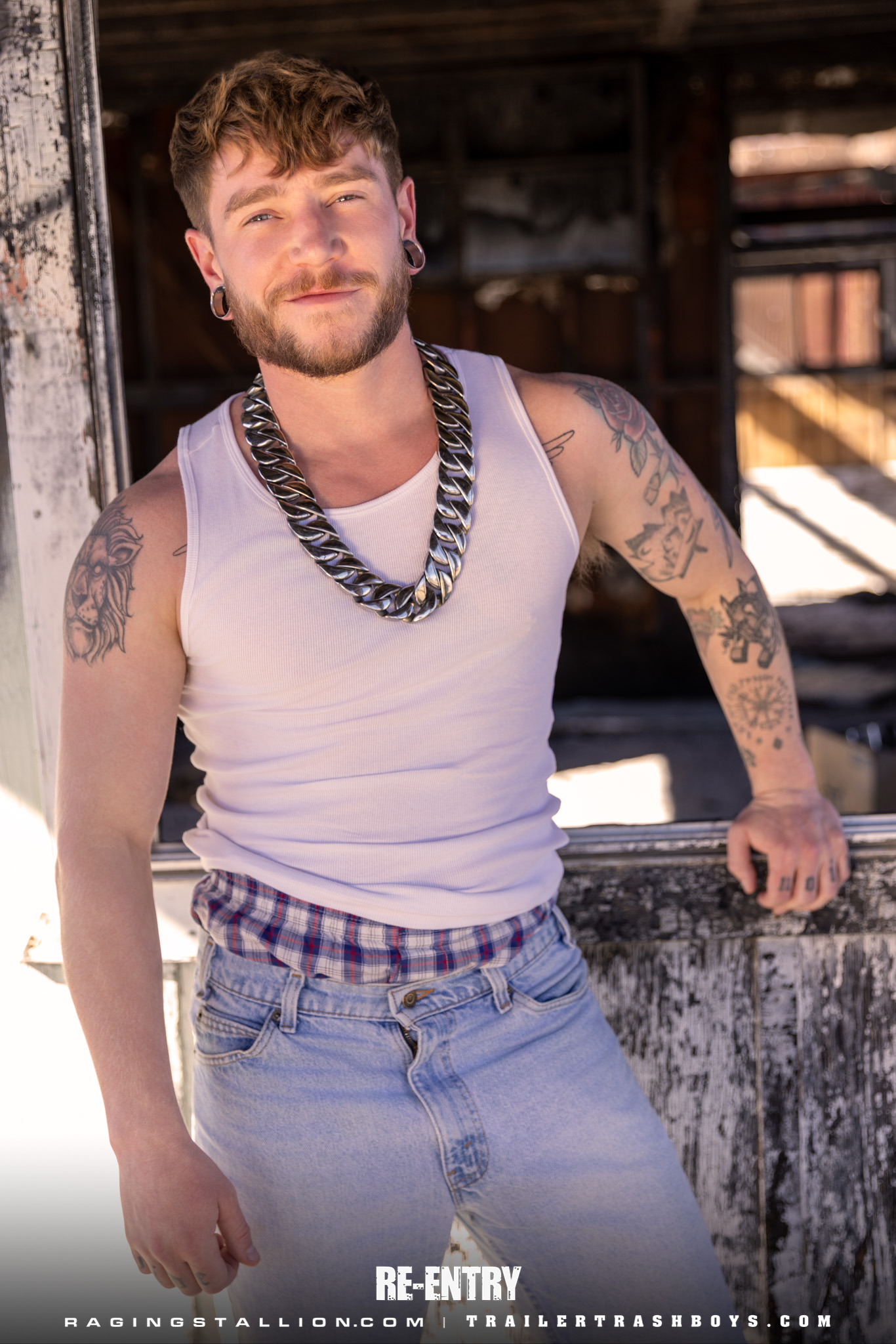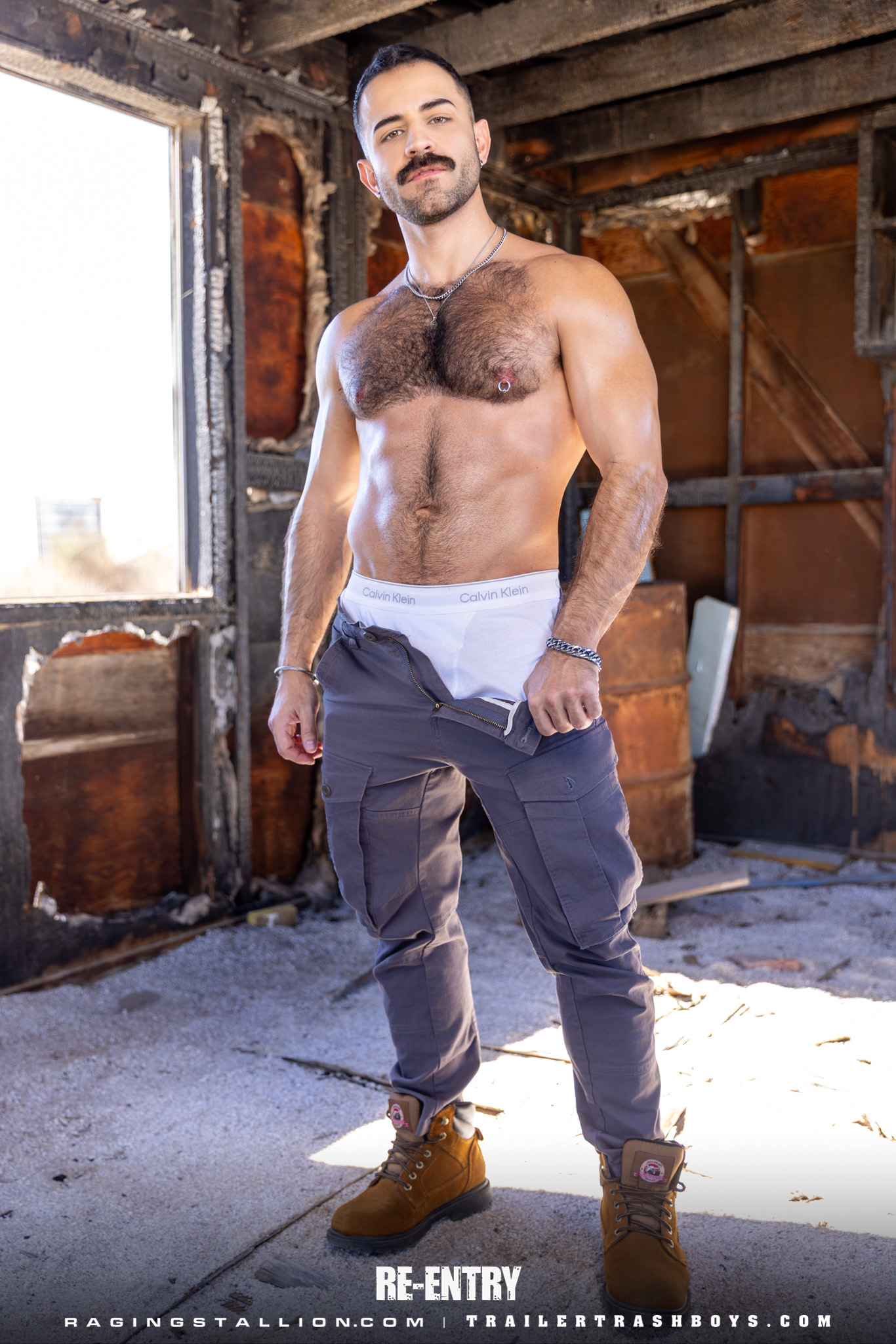 Gay construction worker Tom Colt strips & shows his hairy inked body & cock