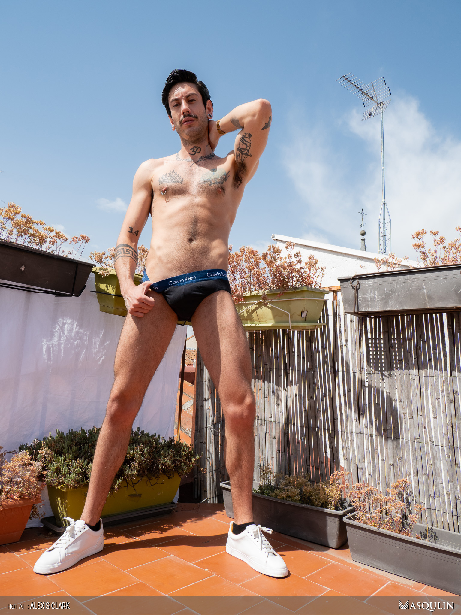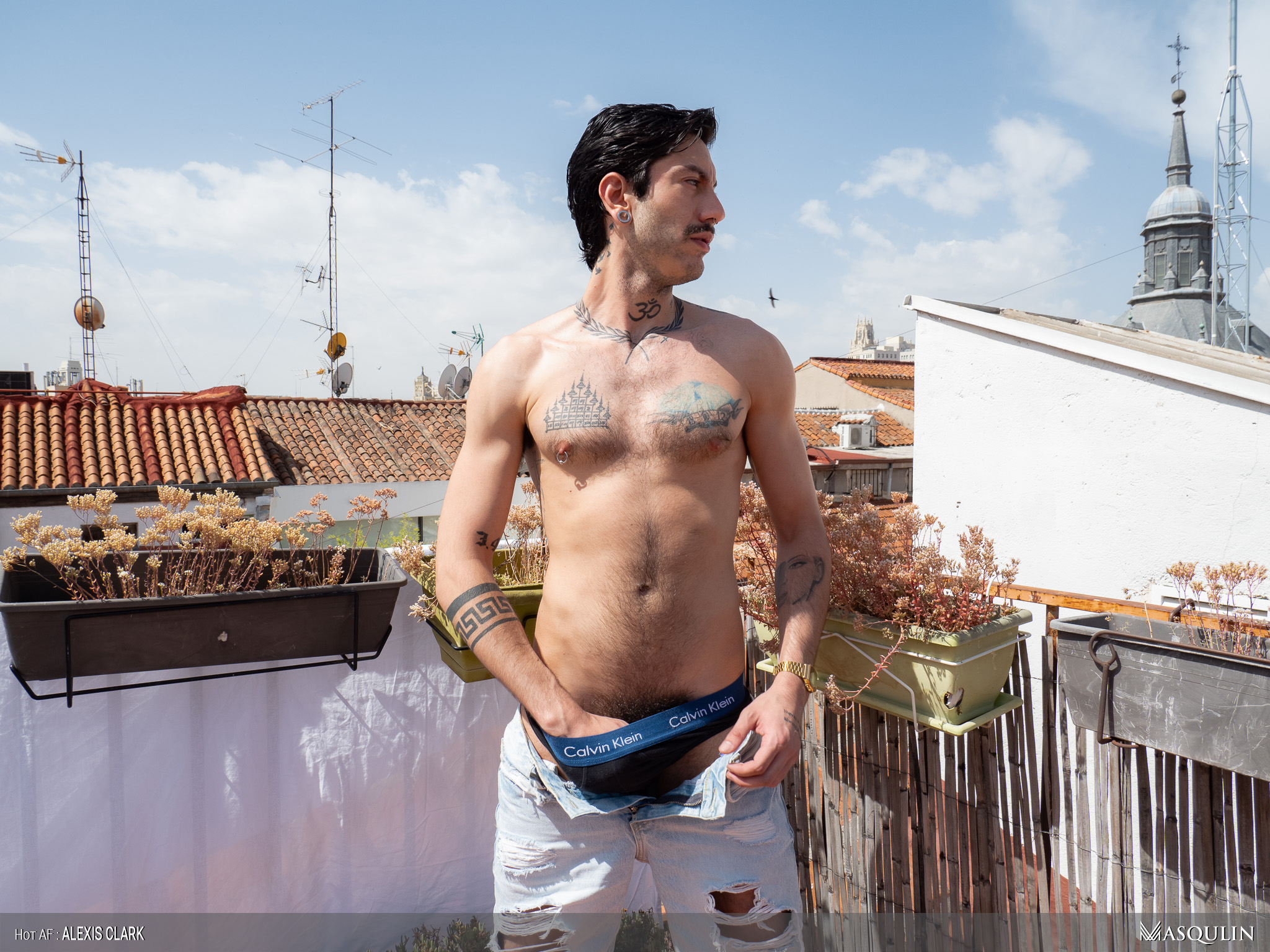 Hunky gay bodybuilder Clark Reid flashes his ass outdoors before posing naked